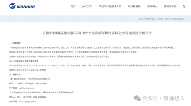 2月24日,万融新材料(福建)有限公司中外合资高端聚烯烃项目社会稳定风险分析公示。